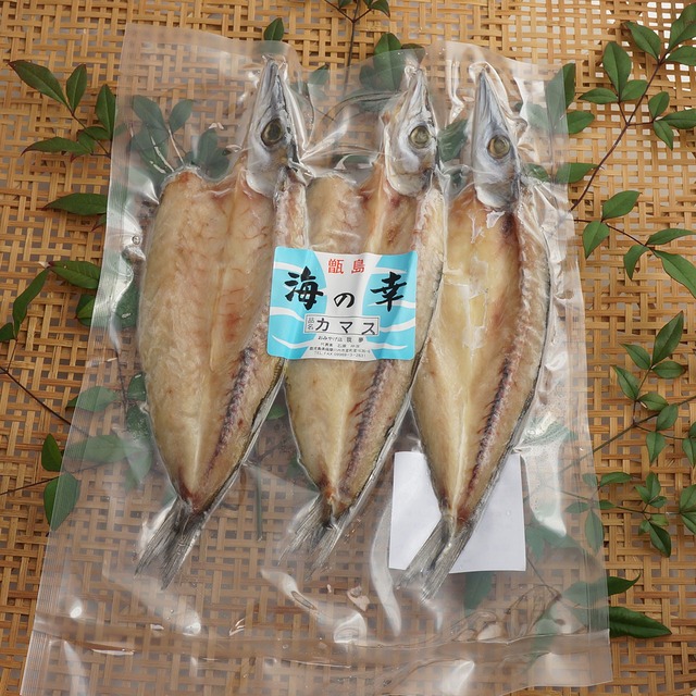 甑島近海で捕れたカマスを絶妙な塩加減で天日干し、魚焼き器やフライパンで焼いて熱々ホクホクをお楽しみください。 ※画像は3枚入り1パックです。